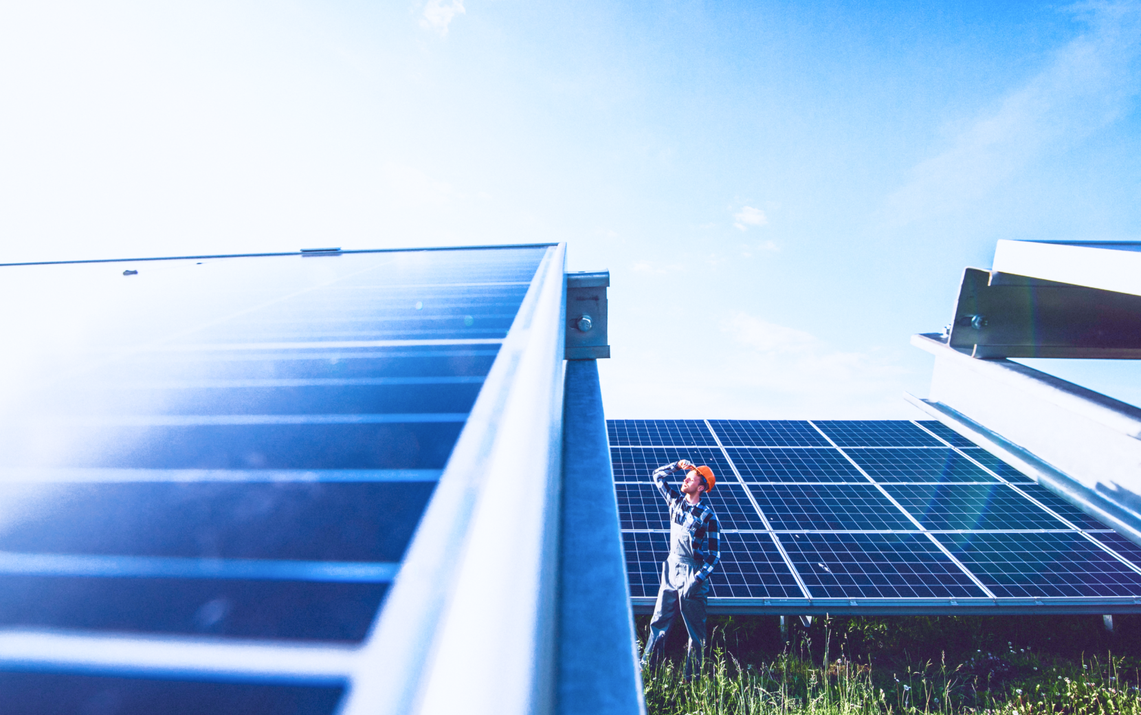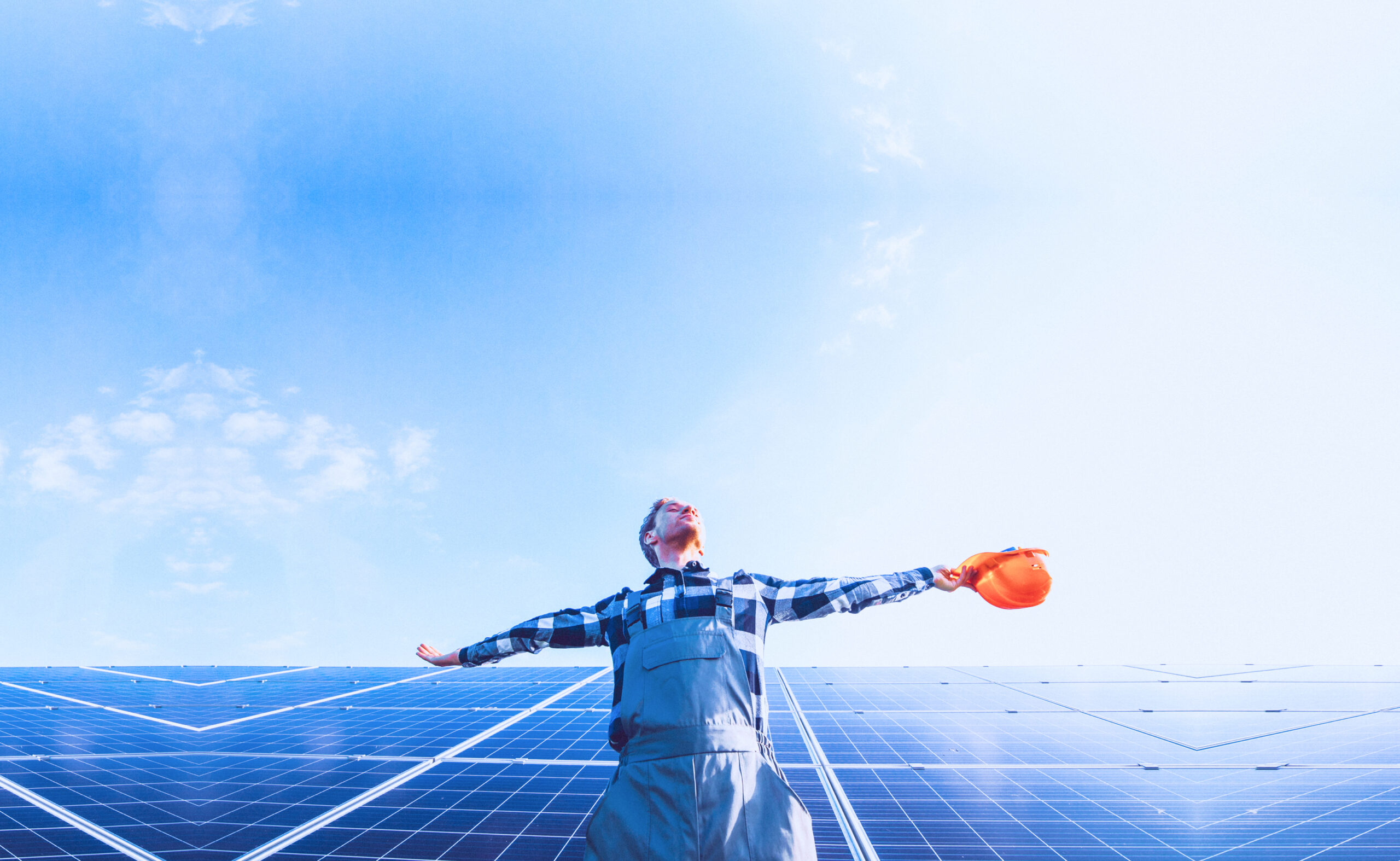 Male worker with solar batteries. Man in a protective helmet. Installing stand-alone solar panel system.